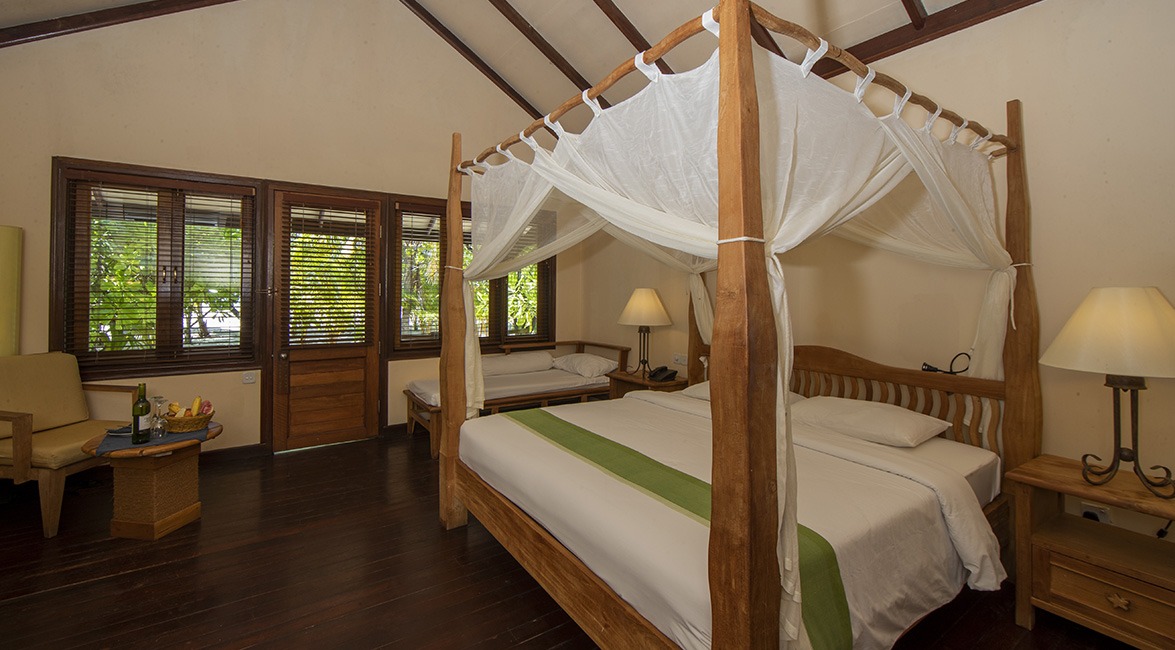 Das Resort verfügt über 125 Zimmer, Pool mit Liegeterrasse, eine Rezeption, einen Souvenirshop und eine kleine Bibliothek. Am Strand und auf der Sonnenterrasse sind Strandtücher und Sonnenliegen kostenlos verfügbar. Weiterlesen>>> Zimmer Anzahl: 125 Die geräumigen, mit viel Holz in natürlichen, warmen Farben eingerichteten Zimmer sind auf der ganzen Insel verteilt. Villa Superior: In Reihenbungalows (ca. 56 m²) stilvoll eingerichtet mit halb-offenem Bad mit Dusche/WC, Föhn, Sat.-TV, Telefon, Klimaanlage, Deckenventilator, Minibar (gg. Gebühr), Kaffee-/Teezubereiter, Safe und Terrasse mit Liegestühlen. Villa Deluxe: Befinden sich, in freistehenden Bungalows (ca. 67m²) und verfügen bei sonst gleicher Ausstattung zusätzlich über eine Badewanne und eine Sitzecke. Water Villa: Bei sonst gleicher Ausstattung wie die Villa Deluxe geräumiger (ca. 90 m²) und auf Stelzen über der Lagune erbaut. Sie verfügen zusätzlich über einen privaten Whirlpool sowie eine Terrasse mit Holzschaukel und direkten Zugang zum Meer. Sport (inklusive - teils durch Fremdanbieter) Schnorcheln (Ausrüstung gg. Geb.), Fitness-Center, Beachvolleyball, Tischtennis und Darts. Sport (nicht inklusive - teils durch Fremdanbieter) Windsurfen, Segeln, Kanu, Katamaransegeln, Kajak, Billard, Kajak, Stand-up Paddle, Wakeboard, Fun Ride, Schnellboot Vermietung. Verpflegung/Gastronomie Der gastronomische Bereich umfasst ein À-la-carte-Restaurant mit internationaler Küche, sowie ein Hauptrestaurant mit Buffetgerichten. All inclusive (gegen Aufpreis buchbar) Frühstück, Mittag- und Abendessen, Nachmittags Tee und Kaffee sowie Snacks im À-la-carte-Restaurant, ausgewählte alkoholische und alkoholfreie Getränke glasweise (Softgetränke, Bier, Hauswein, Whisky, Gin, Wodka, Brandy, Tequila, Rum, Arrack und Martini) sowie eine kleine Auswahl an Cocktails von 10 bis 24 Uhr Unterhaltung Gelegentlich Abendunterhaltung. Aktivitäten Zu den verfügbaren Ausflügen gehören Sonnenuntergangs- und Morgenangeln, Trolling-Angeln, Inselhüpfen, Schnorcheln und spezielle Flitterwochenausflüge. Familien/Kinder - Wellness Im Spa werden diverse Massagen und Schönheitsbehandlungen angeboten. Honeymooner In vielen Unterkünften erhalten Hochzeitsreisende eine bevorzugte Behandlung. Sei es in Form einer kleinen Aufmerksamkeit in Zimmer, ein kostenloses Dinner, ein Upgrade auf eine bessere Zimmerkategorie etc. Teile uns im Anfrage Formular mit, falls es sich um eine Hochzeitsreise handelt. Wir werden das Hotel gerne entsprechend informieren! (Mehr Infos betr. Gültigkeit der Leistungen, Hochzeitsurkunde, etc. können wir dir gerne zukommen lassen.) Änderungen vorbehalten -