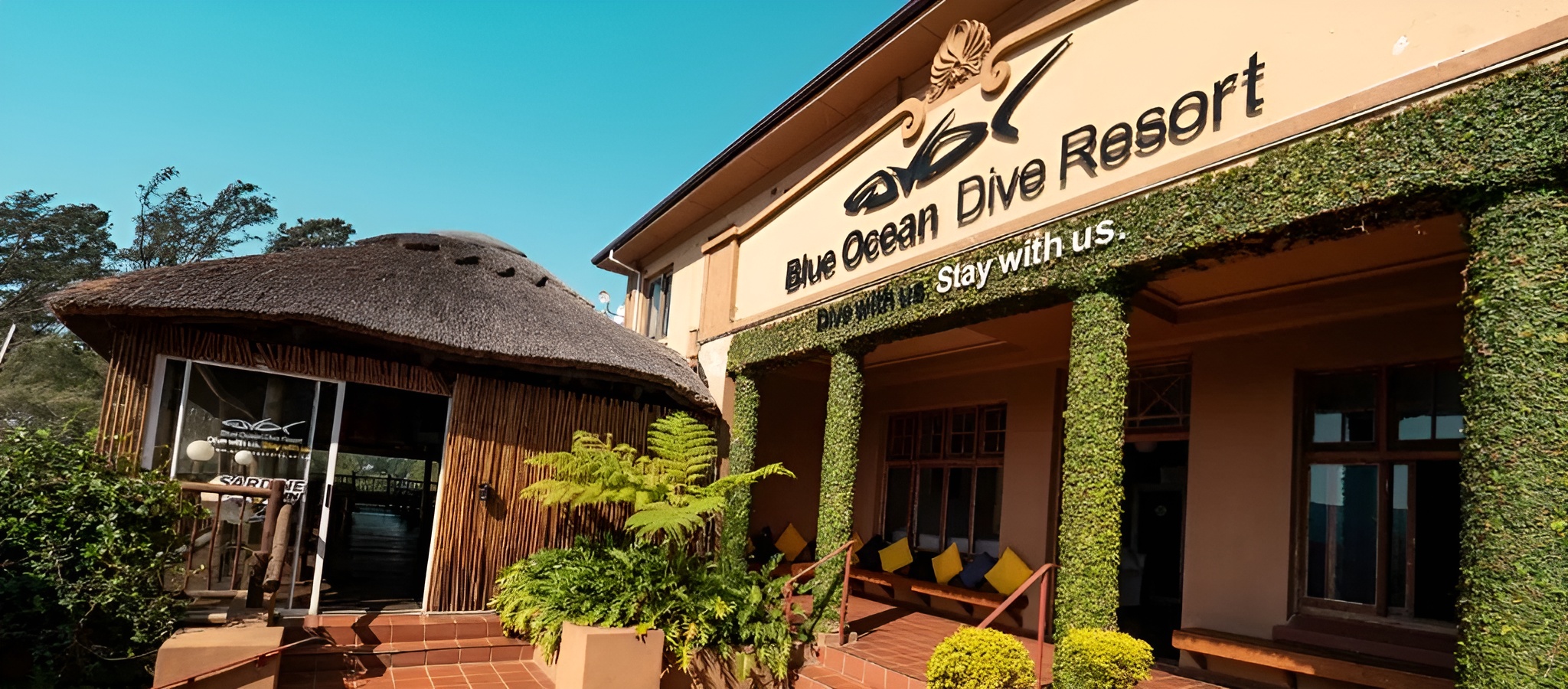 Blue Ocean Dive Umkomass befindet sich in einem malerischen Resort direkt am Indischen Ozean, eingebettet in eine üppige Landschaft und mit direktem Zugang zu den berühmten Tauchplätzen von Aliwal Shoal. Der Transfer vom Flughafen Durban zum Resort dauert etwa 60 Minuten per Auto.